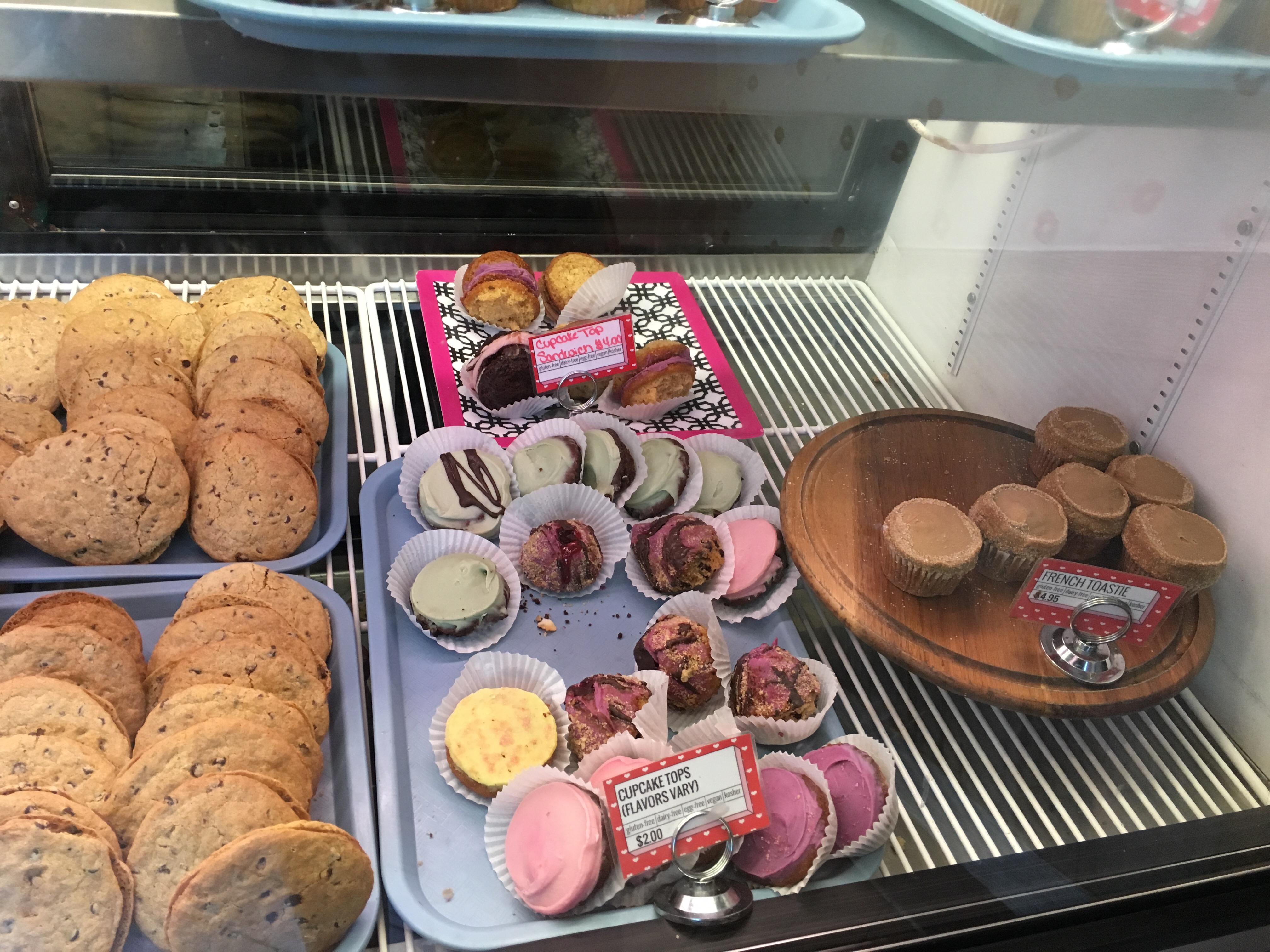 Their menu is almost entirely sweet treats. They do carry soft serve ice cream (I didn’t ask what it’s made of) and they have a few flavors of bagels. But the reason to go here is for the goodies, as far as I can tell. Their offerings included tea cakes, cupcakes, cupcake tops, frosting shots, at least six kinds of donuts, cookie cake, brownie treats and bites, and much more.